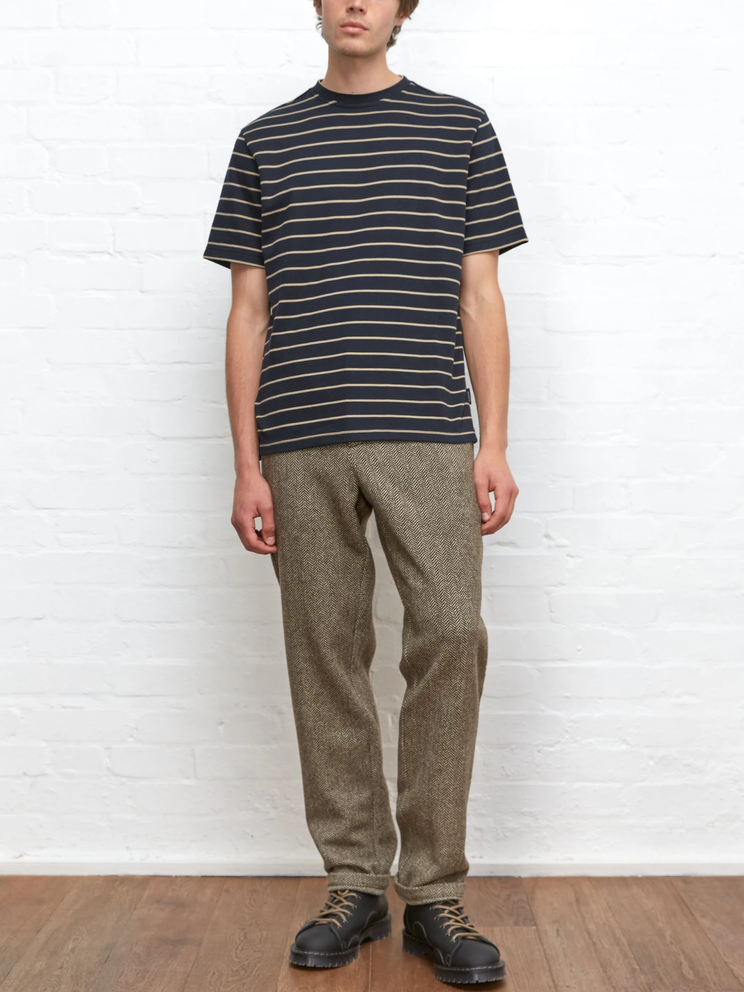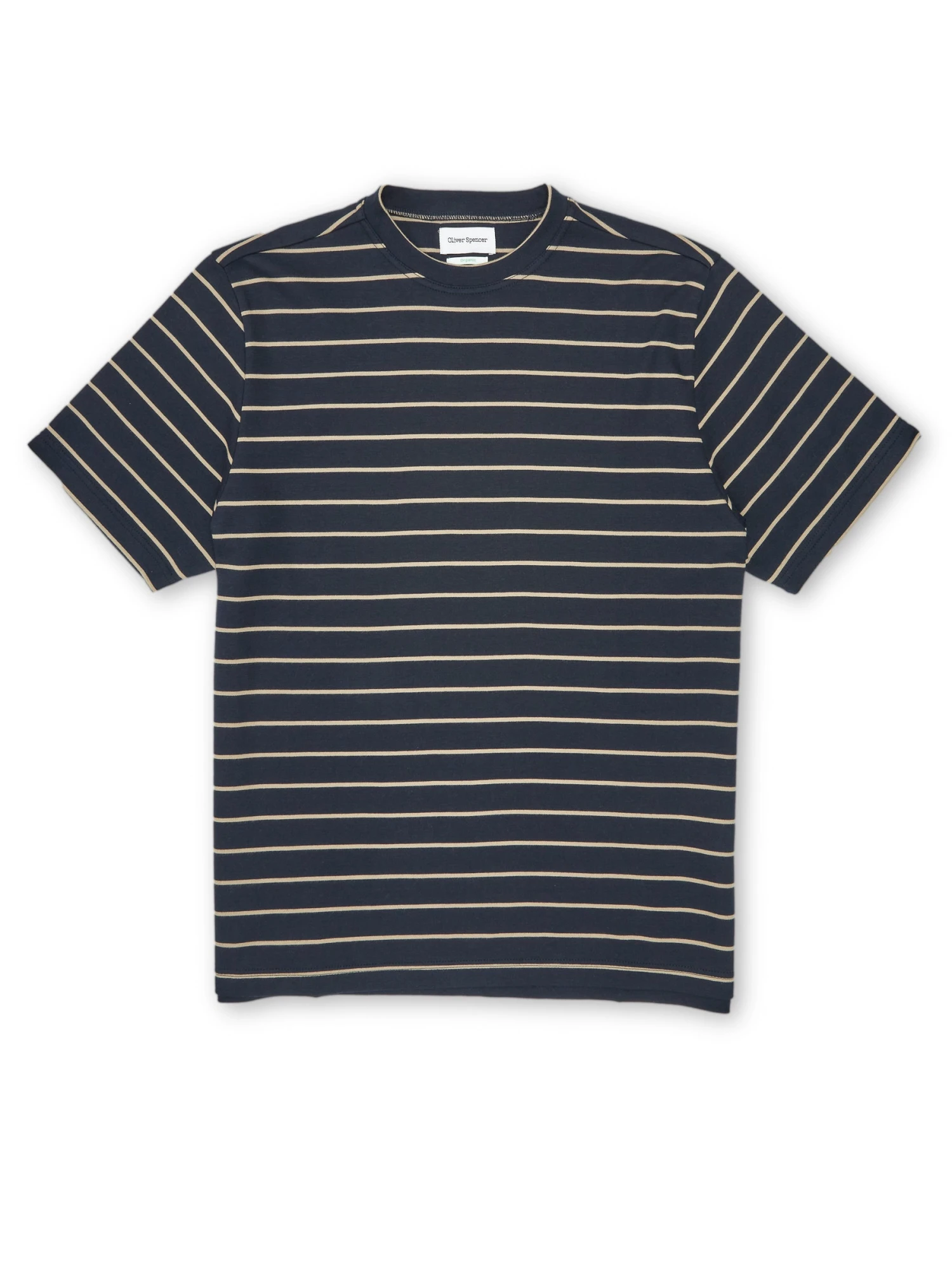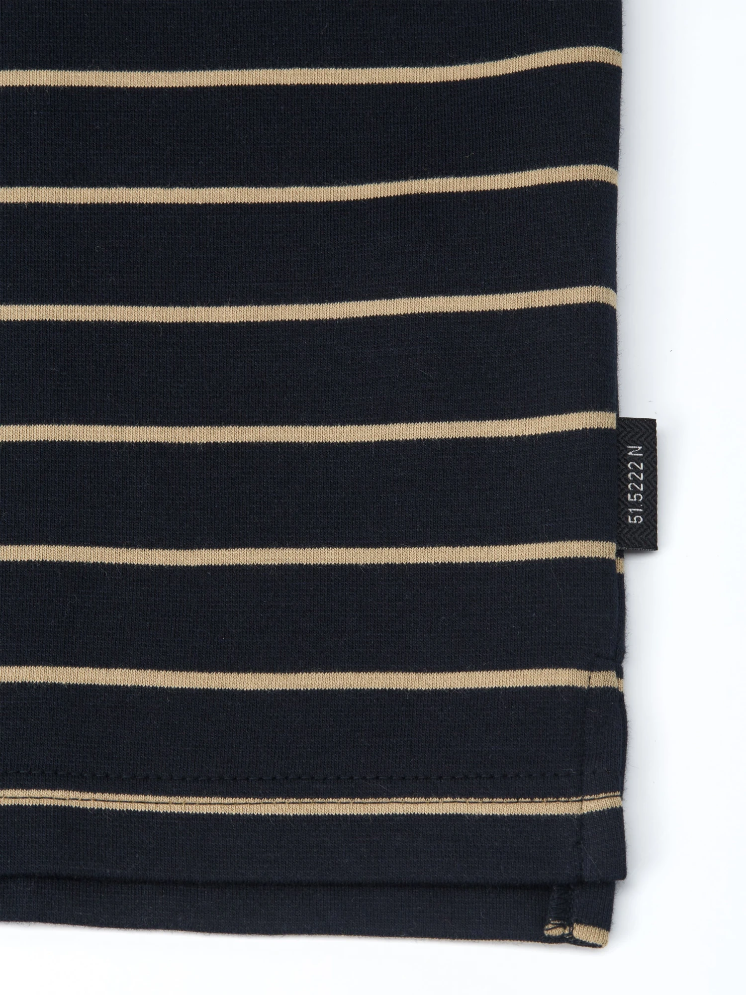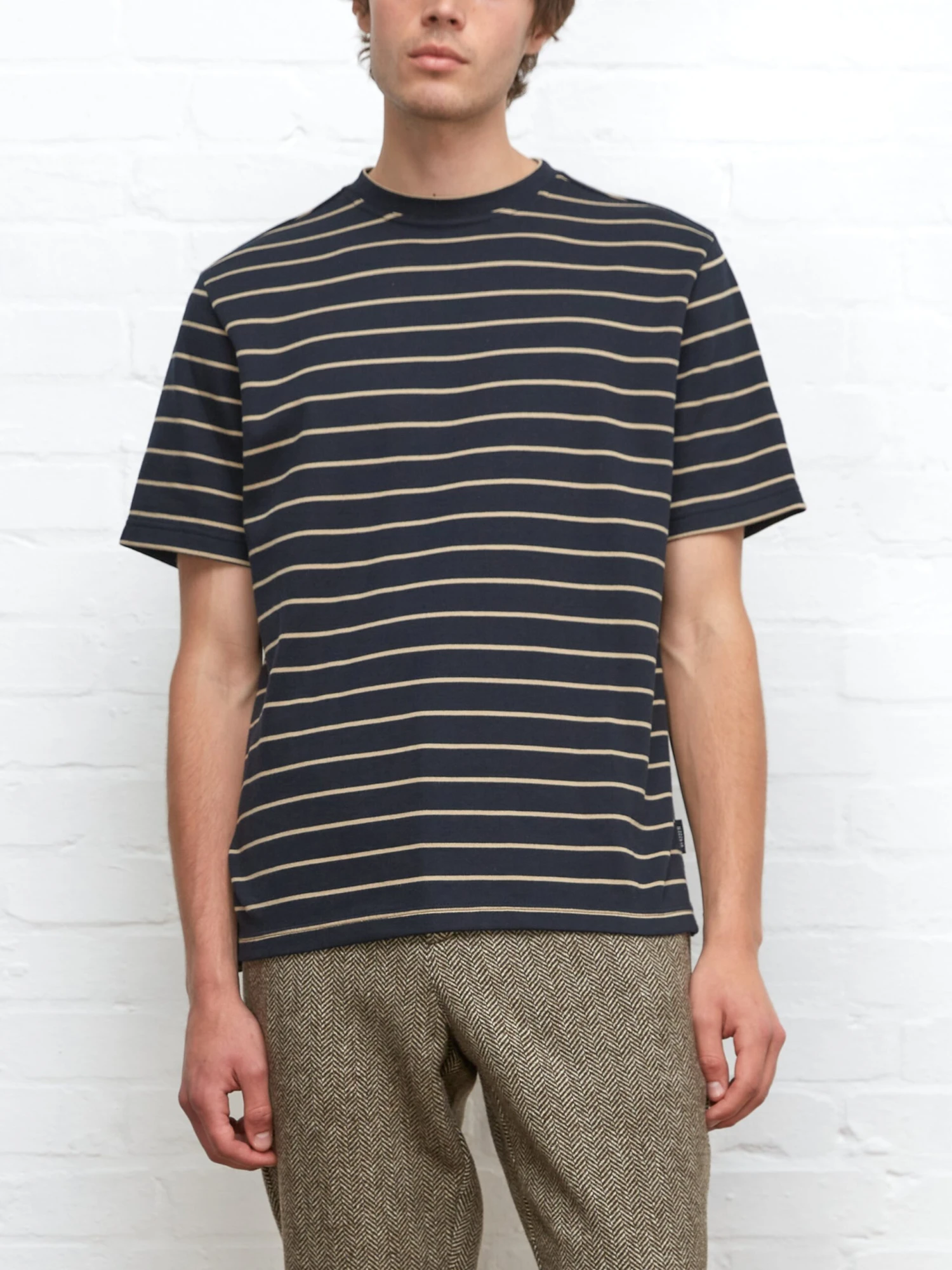 A modern riff on the traditional Breton tee, our version brings together the easy pairing of light beige stripes against a rich backdrop of soft navy organic cotton, to create a super versatile year-round t-shirt that you can style in myriad ways.