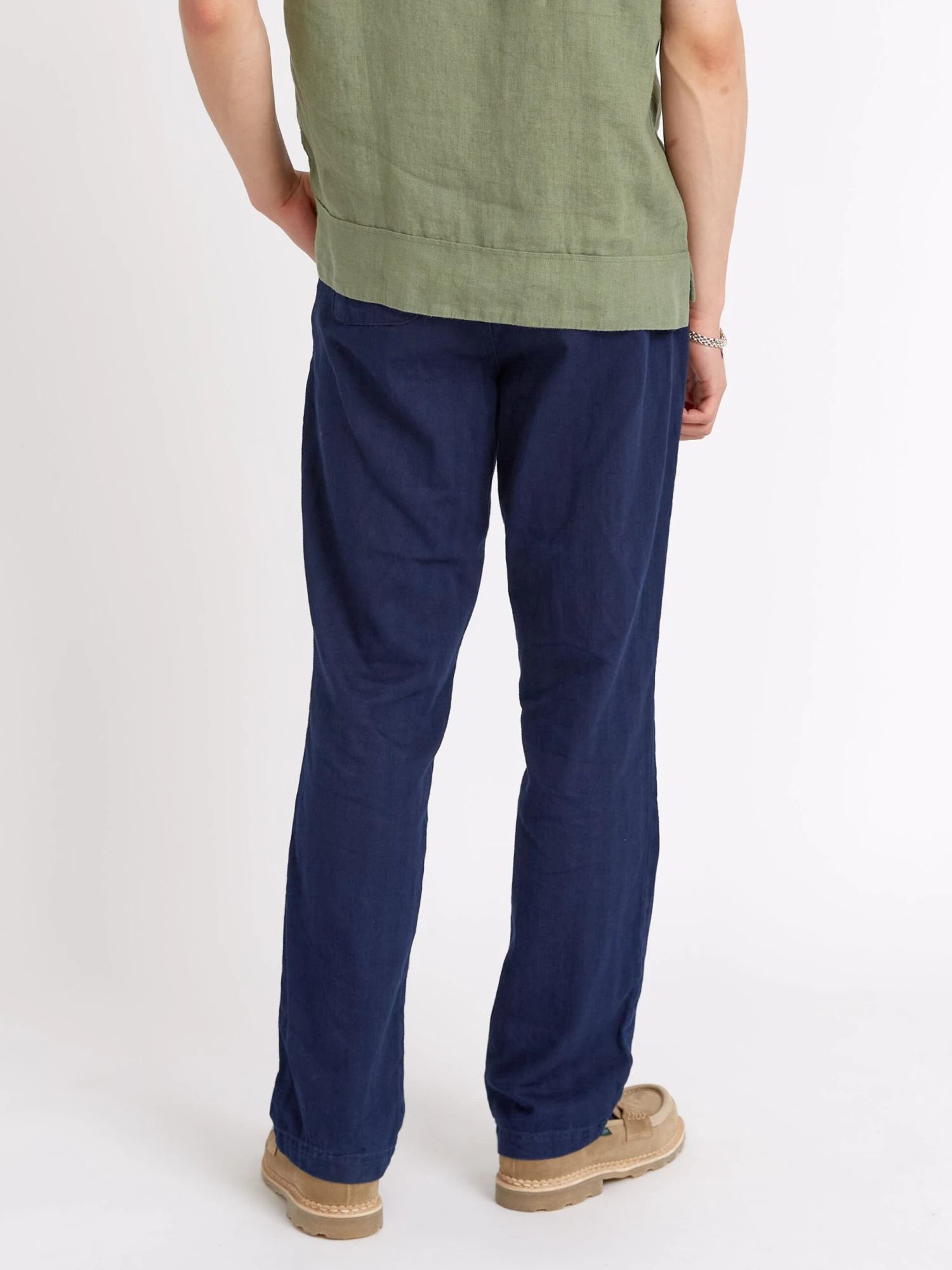 An Oliver Spencer classic, the drawstring trouser is a relaxed style cut straight through the leg with two back pockets, a cotton drawstring through the waistband and a button fly. This style is cut from a rich indigo-dyed cotton with a subtle herringbone weave and is a great alternative to traditional denim.