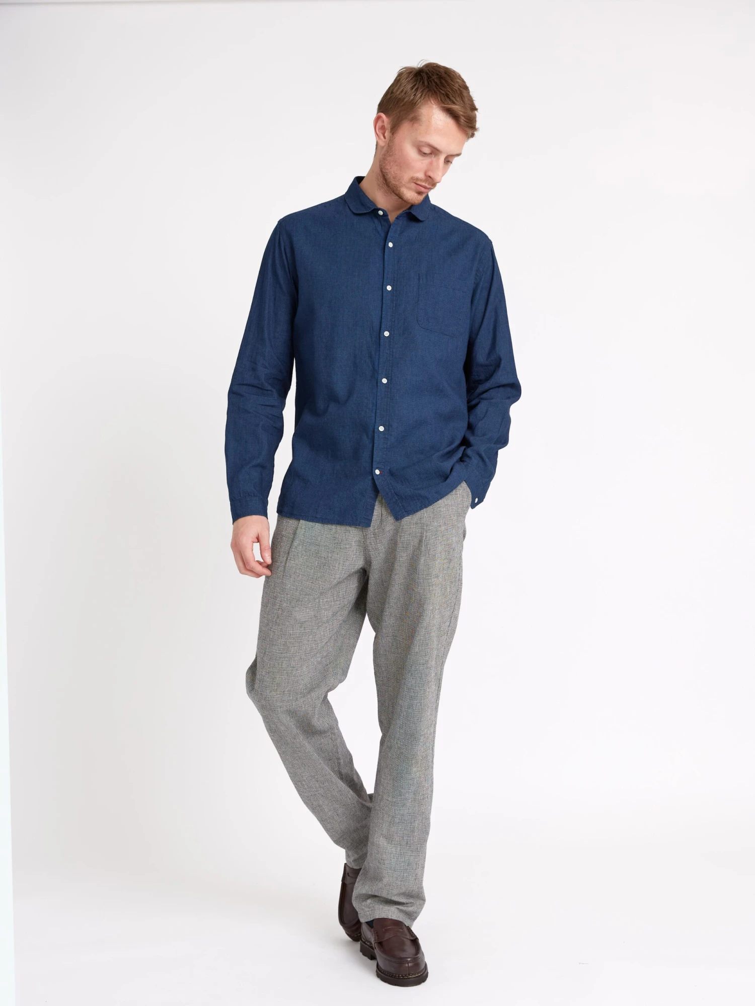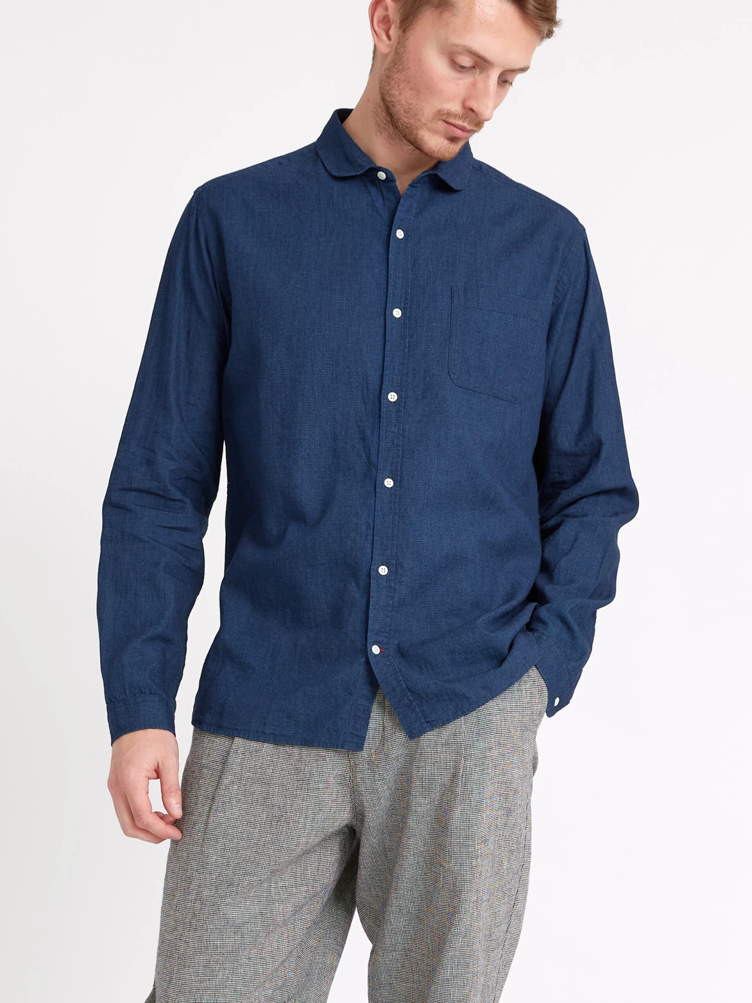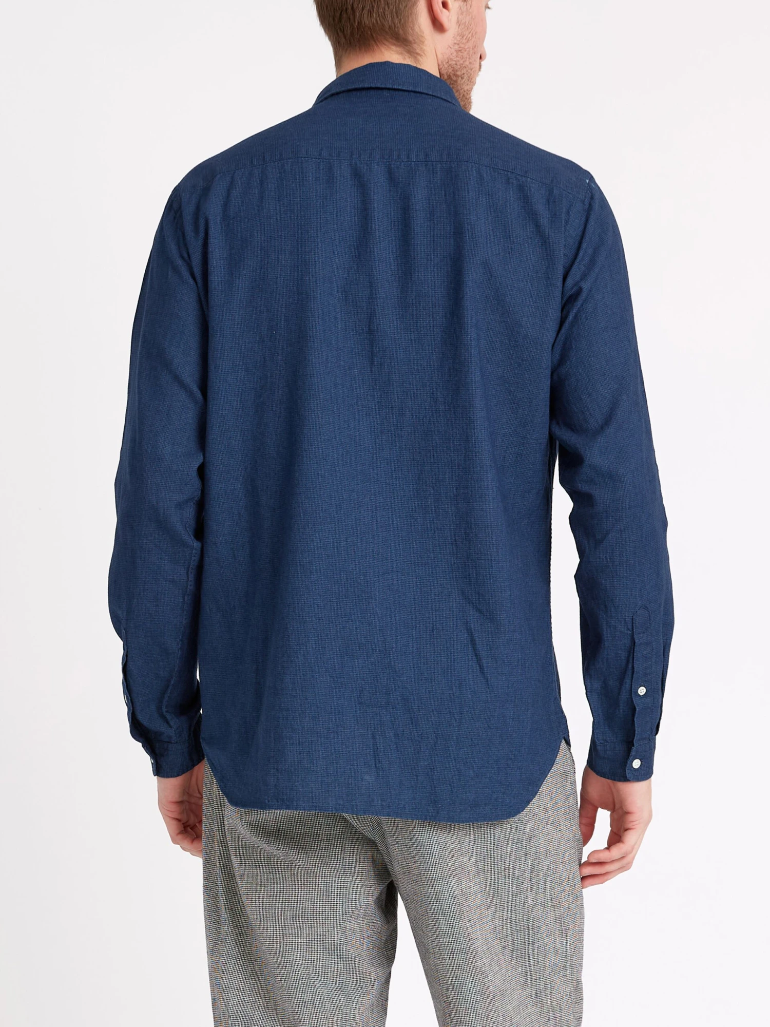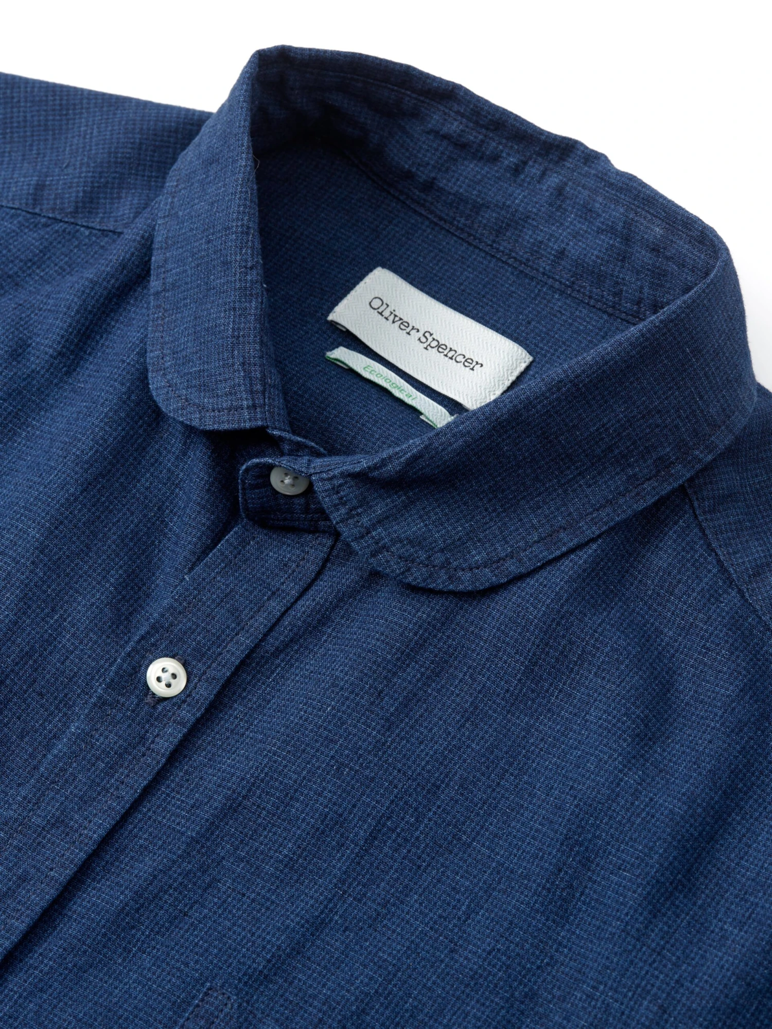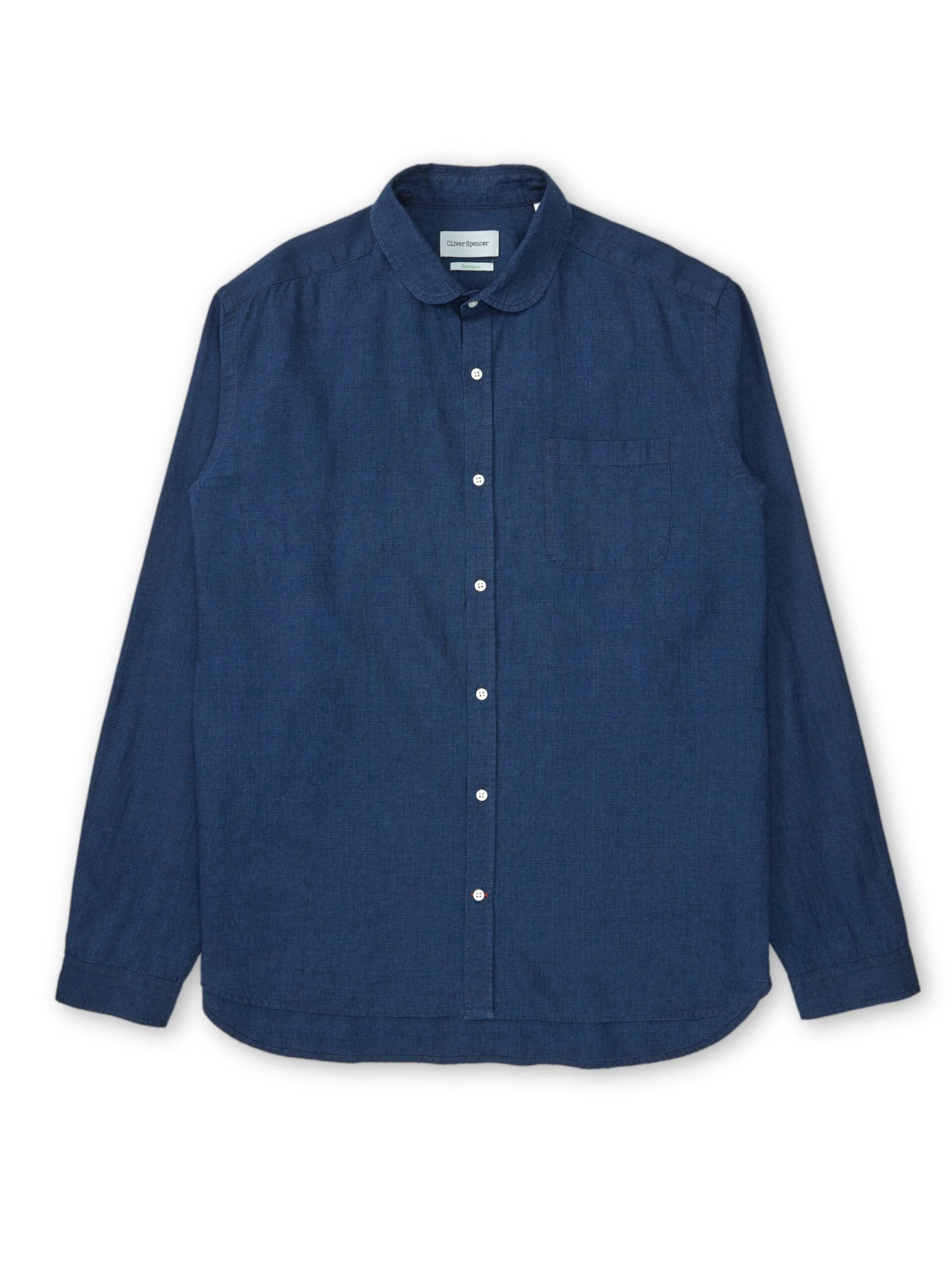 The Eton is one of our most popular collar shapes. Characterised by its neat curved shape, it is a relatively small collar which looks great buttoned up to the neck, with or without a tie, or can equally be worn unbuttoned. This versatile navy linen and cotton blend style is a great addition to your casual wardrobe, being really simple to style with chinos or denim.