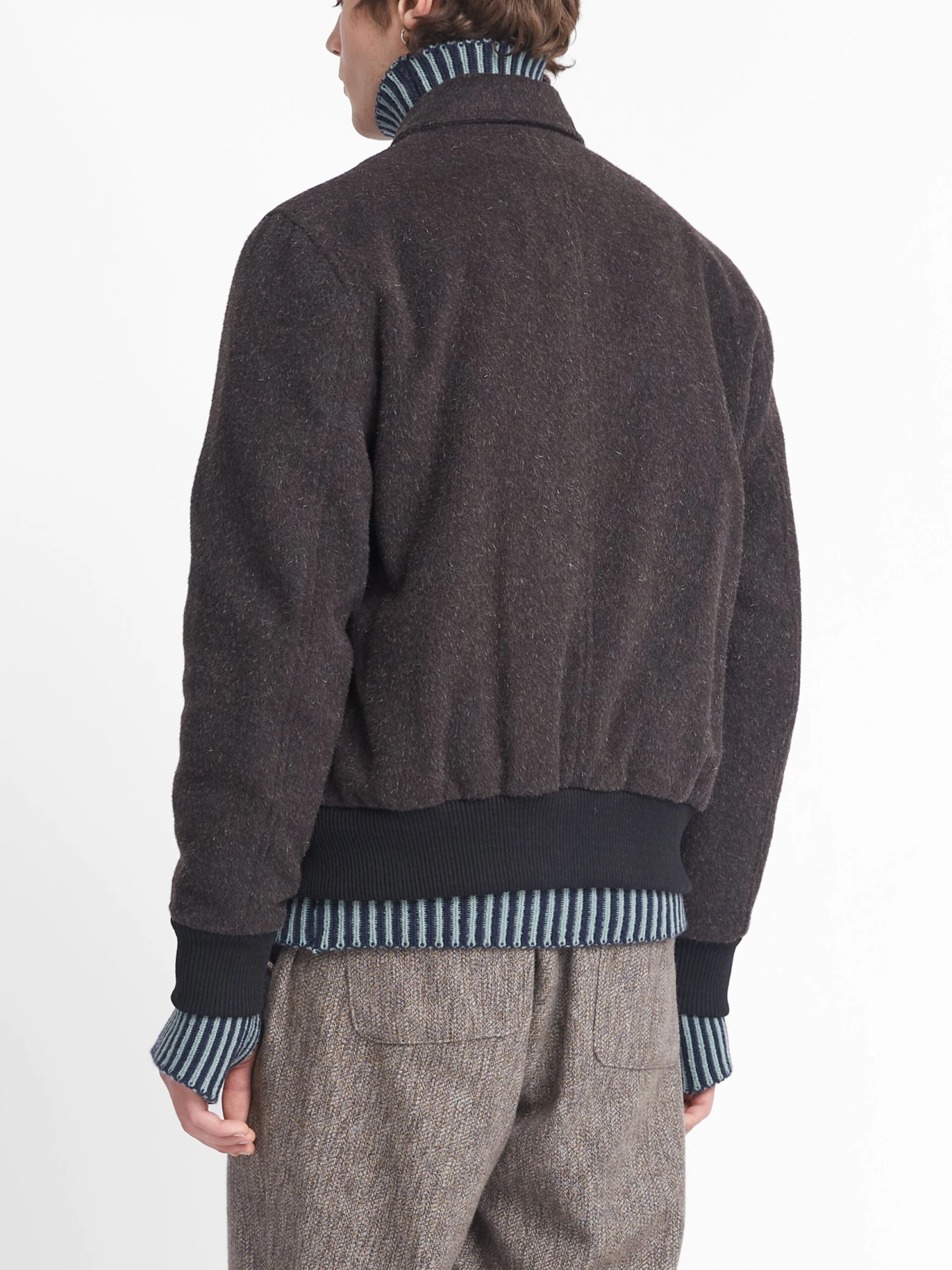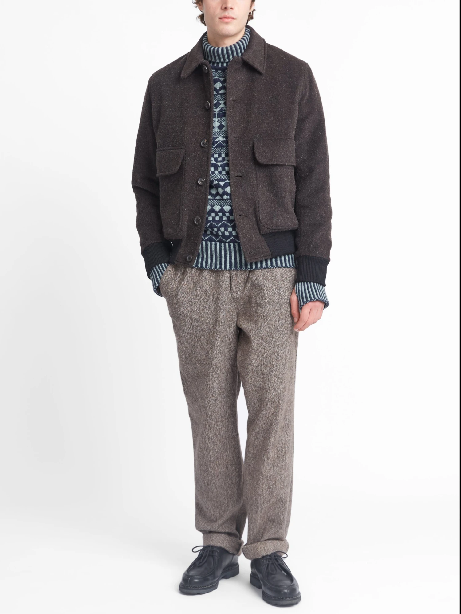 Cut in a traditional bomber jacket silhouette, the Linfield bomber features a turn-down colour and two front flap pockets. A menswear classic, this Regent Brown bomber has been constructed from a beautiful textured wool with highlight flecks, and is perfect worn with dark wool trousers or selvedge denim.