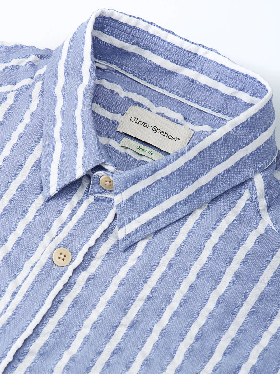 The regular-fit New York Special is a modern classic and one of our most popular shirt styles for good reason. This blue stripe cream version is made from 100% organic cotton and features a dimpled effect for textural interest. Wear it with navy or white shorts for a chic riviera aesthetic.