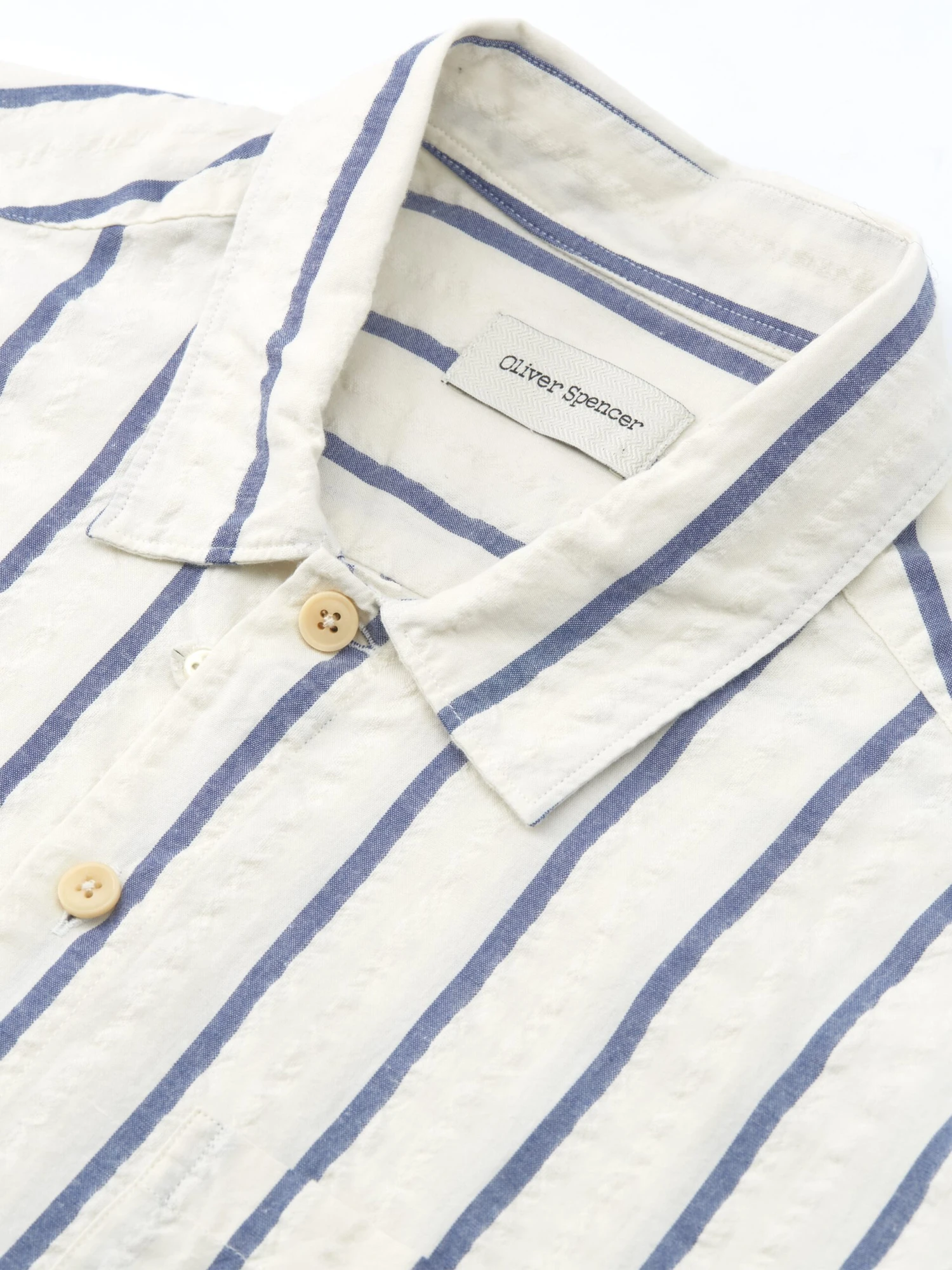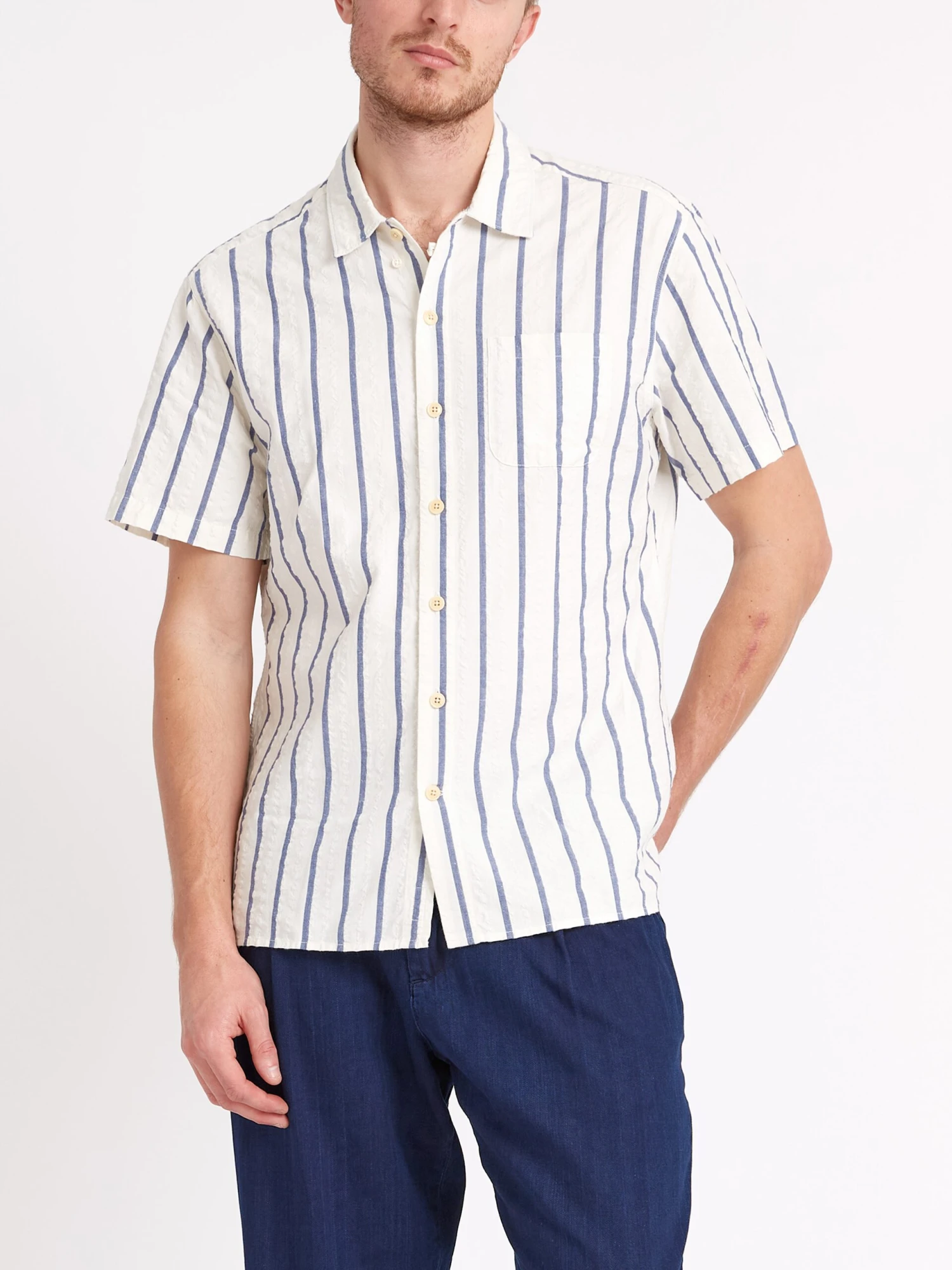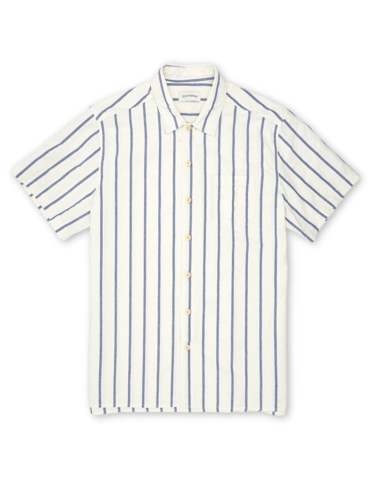 A modern classic, our Riviera short-sleeve shirt is non-negotiable summer silhouette. Cut from a cotton cloth, this white and blue style is a great look with neutral tone chinos in spring, or tailored shorts throughout the summer months.
