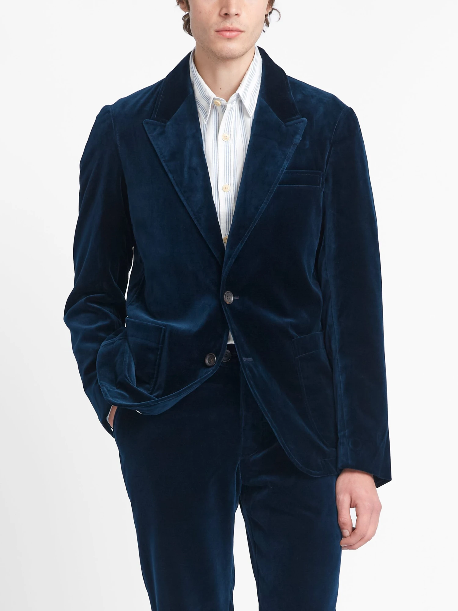 Part of our exclusive Mr Porter Velvet Capsule, this unstructured peak lapel Mansfield jacket in sapphire blue velvet is a smart and bold addition to your tailoring rotation. Super tactile and with a light natural drape, it comes paired with our tapered fishtail trousers. It’s a really textural way to elevate your smart casual wardrobe.